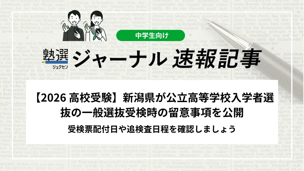 新潟県教育委員会が、令和8年度(2026年度)新潟県公立高等学校入学者選抜の一般選抜に向け、「受検する皆さん及び保護者の皆様」へ向けた留意事項を公表しました。受検票の配付時期や試験当日の持ち物、体調不良時の追検査対応など、受検生が事前に確認すべき5つの重要項目がまとめられています。