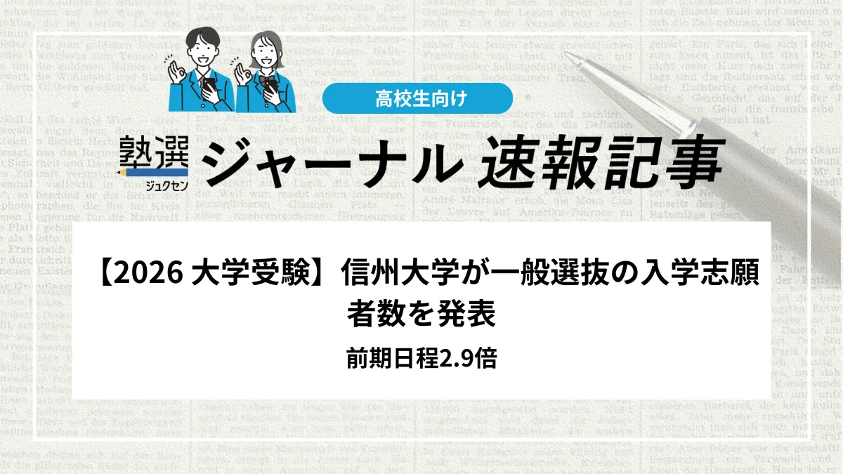 信州大学は2月10日、令和8年度(2026年度)一般選抜の確定志願者数を公表しました。前期日程と後期日程を合わせた総志願者数は5,933人で、全学の志願倍率は、前期日程が2.9倍、後期日程が7.1倍となっています。