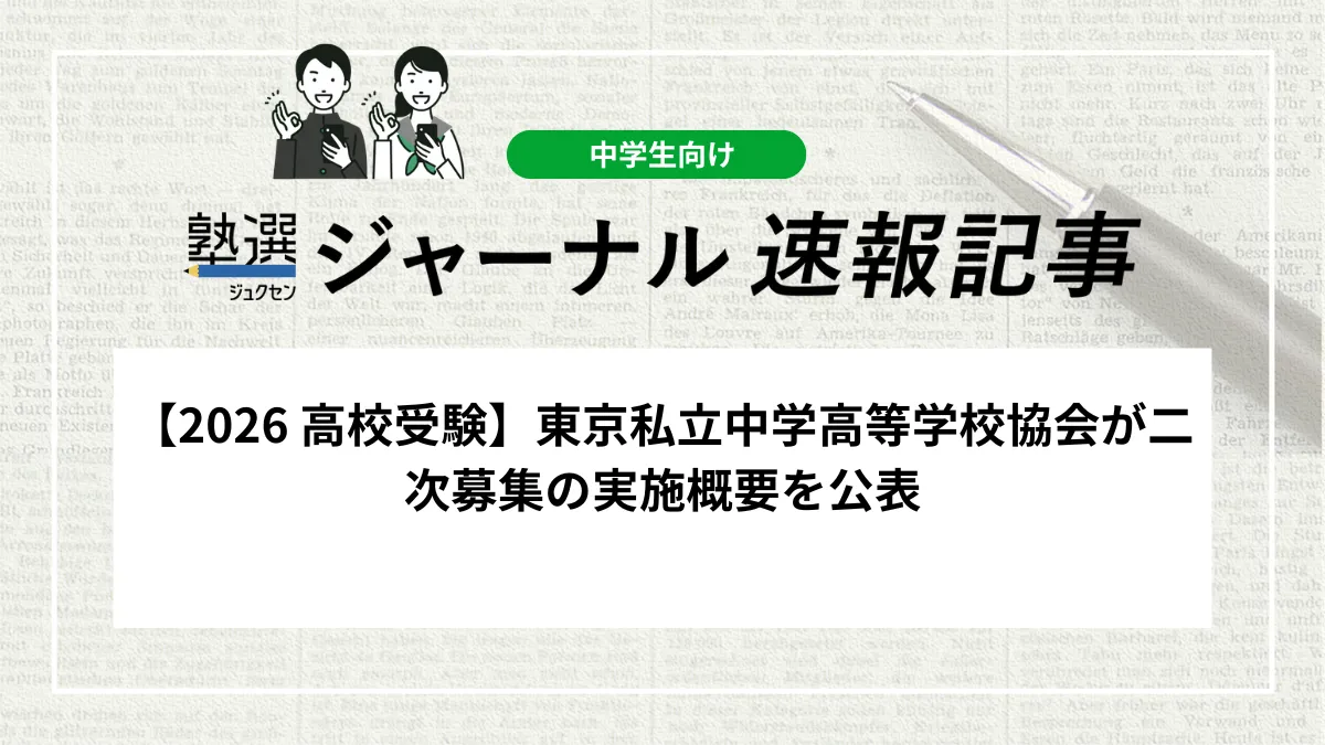 一般社団法人東京私立中学高等学校協会より、令和8年度(2026年度)入試における第二次募集(欠員補充)の実施概要が公表されました。以下は全日制課程における募集校の抜粋です。