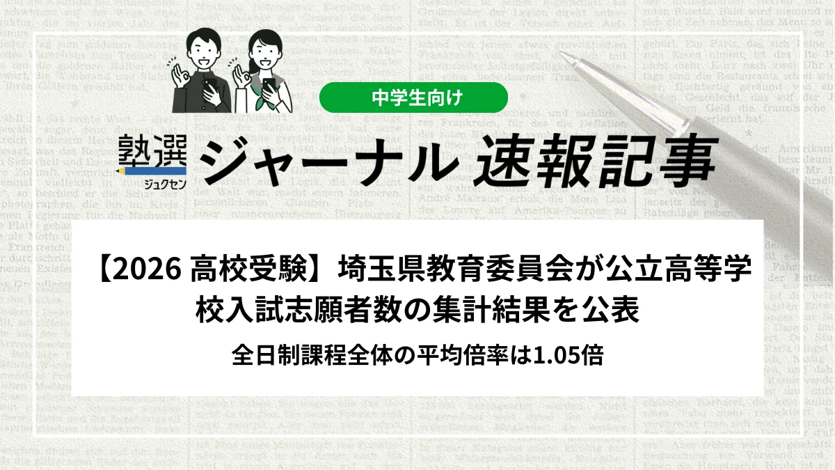 埼玉県教育委員会は2026年2月10日、令和8年度埼玉県公立高等学校入学者選抜における志願者数の集計結果を公表しました。全日制課程全体の平均倍率は1.05倍となっています。