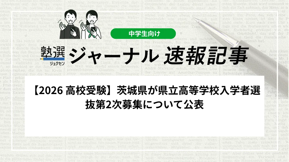 茨城県教育委員会は2026年3月11日、令和8年度茨城県立高等学校入学者選抜における第2次募集の実施校および募集人員を公表しました。全日制課程および定時制課程において、欠員が生じた学校・学科で募集が行われます。