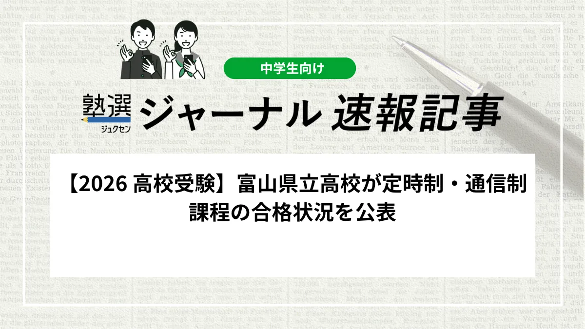 富山県教育委員会は2026年3月25日、令和8年度(2026年度)富山県立高等学校入学者選抜における定時制課程および通信制課程の合格状況を発表しました。定時制課程(単位制前期第2次・単位制以外第1次選抜)では5人が合格し、通信制課程(第1次選抜)では27人が合格しました。