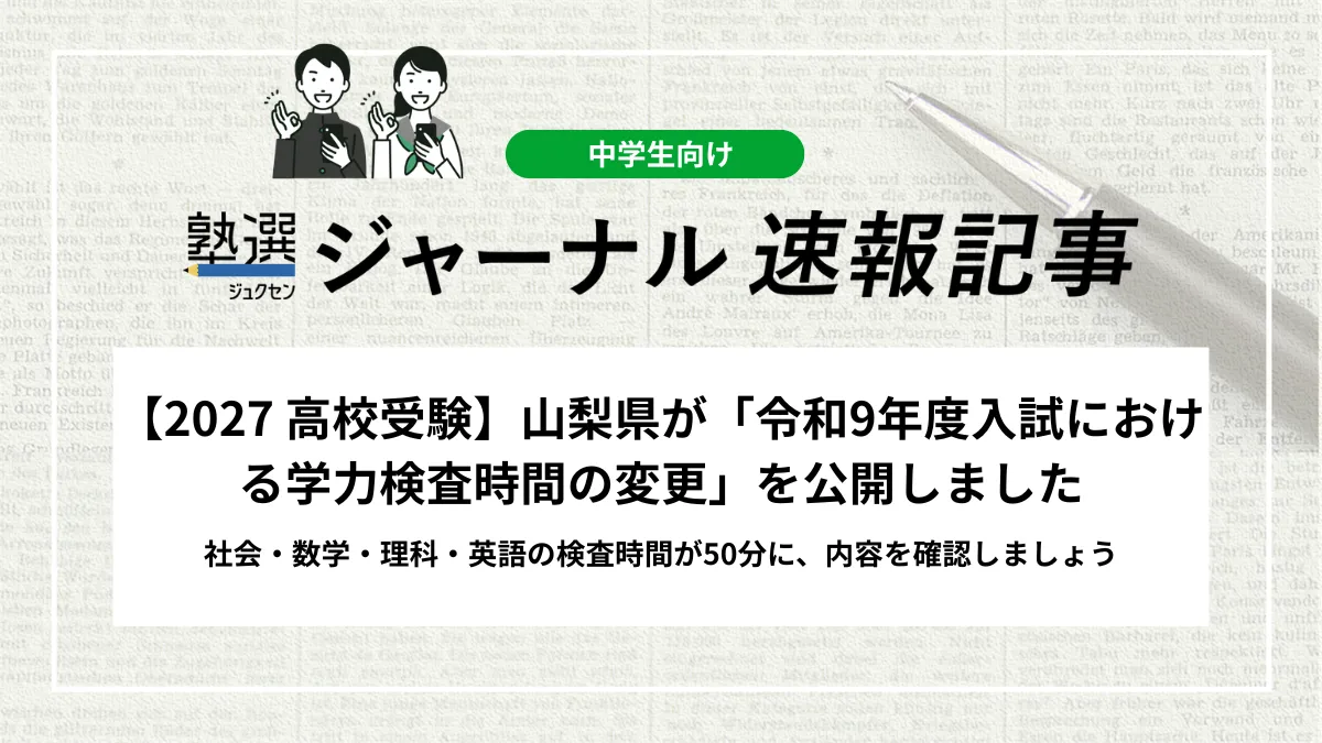 山梨県教育委員会は、令和9年度(2027年3月実施予定)公立高等学校入学者選抜から、学力検査の検査時間を変更することを発表しました。今回の変更により、対象となる4教科の検査時間が一律50分に設定されます。