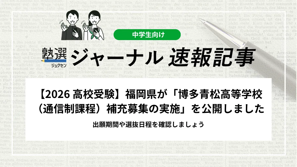 福岡県教育委員会は、2026年4月2日、福岡県立博多青松高等学校(通信制課程)における令和8年度(2026年度)の補充募集実施概要を公表しました。本募集は、学検定料の納付や出願書類の提出など、定められた期限内での手続きが必要となります。