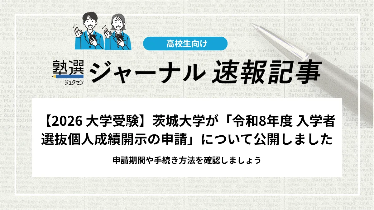 茨城大学は、令和8年度(2026年度)入学者選抜における個人成績の開示申請受付について詳細を公表しました。受験生本人が自身の試験成績を確認できる制度であり、指定された期間内に書面での申請が必要となります。
