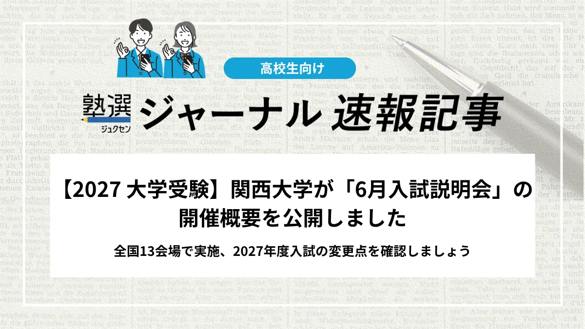 関西大学は、2026年6月に受験生および保護者を対象とした「入試説明会」を全国13会場で開催します。本説明会では、2027年度(令和9年度)入試の変更点やポイントが公開されるほか、現役大学生によるトークセッションや個別相談も実施される予定です。