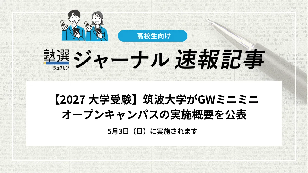 筑波大学は、2026年5月3日(日)に筑波キャンパスにおいて「GWミニミニオープンキャンパス」を開催します。夏のオープンキャンパスの混雑緩和を目的とした試験的な開催で、大学概要説明のほか、日本語・日本文化学類による学類紹介やミニ講義が実施されます。