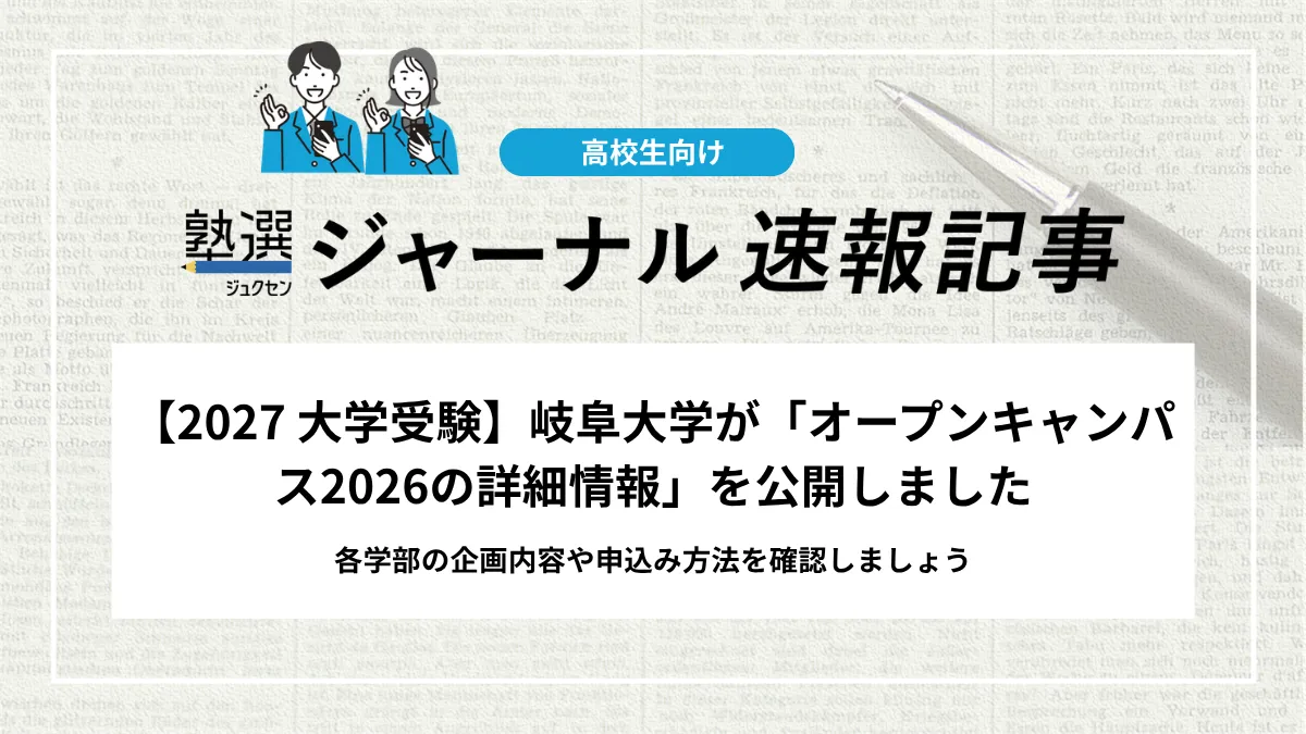 岐阜大学は、2026年4月17日、本年度開催予定の「オープンキャンパス2026」に関する詳細情報を公表しました。各学部・学科等で実施される具体的な企画内容をはじめ、参加申込み方法や会場へのアクセス情報が、公式サイトの特設ページにて一斉に掲載されています。