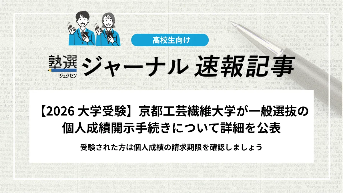 京都工芸繊維大学は、令和8年度一般選抜(大学入学共通テストおよび個別学力検査等)の個人成績開示手続きについて詳細を公表しました。開示対象は受験者本人のみに限定され、本学入学者とそれ以外の受験生で請求期間や方法が異なります。